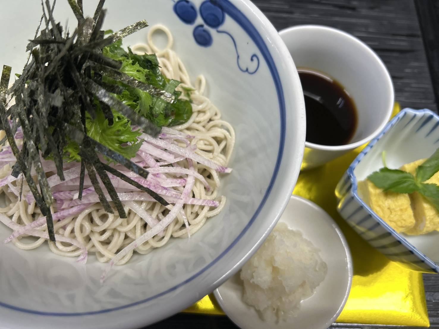 薬味の胡瓜大葉をまぜ、大根の辛味を調整しながらお召し上がりください。